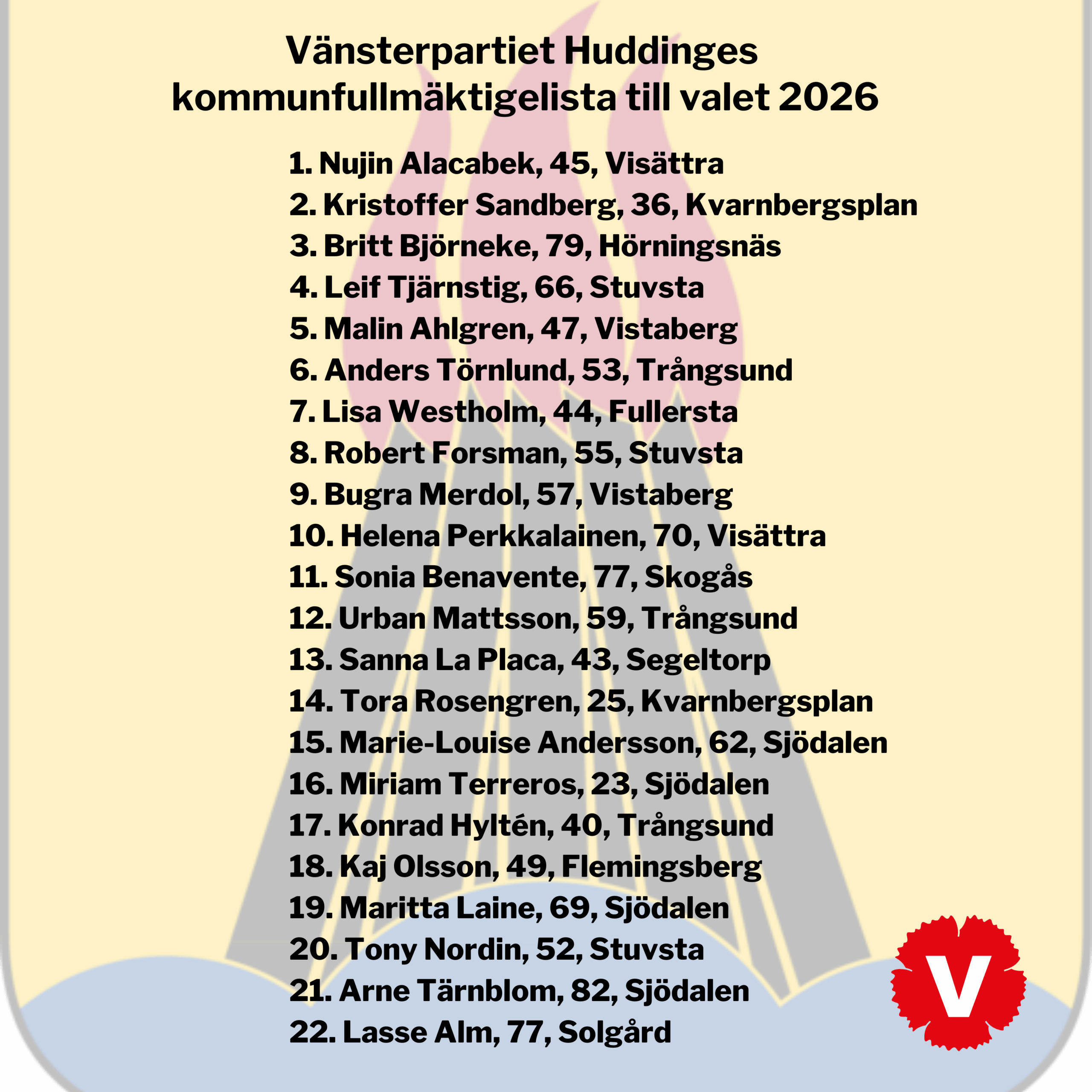 Här är Vänsterparties Huddinges vallista till fullmäktige 2026